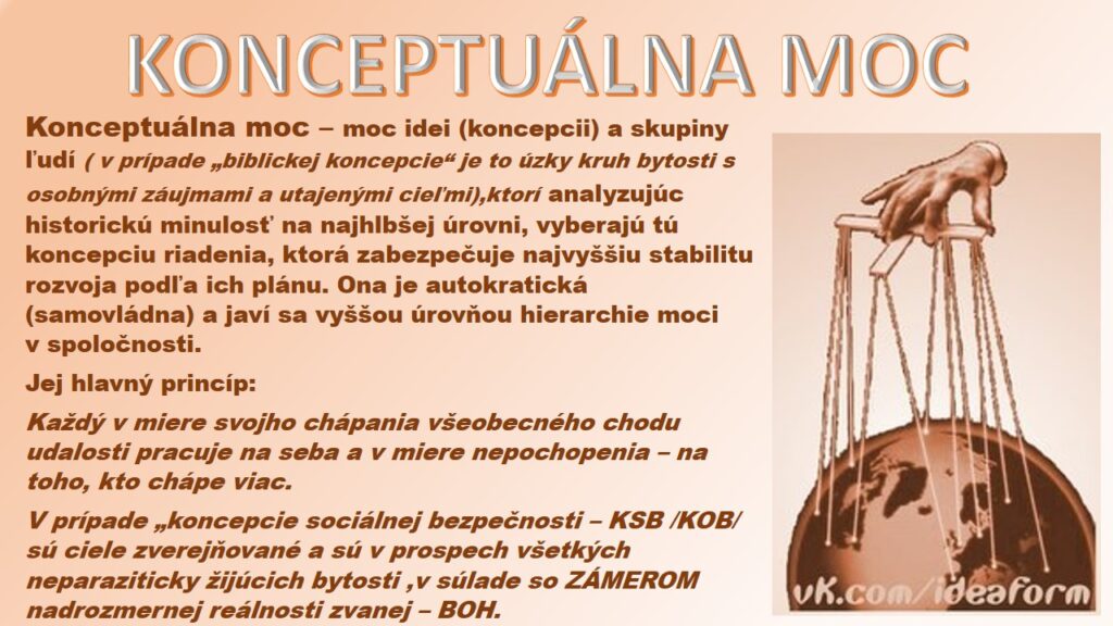 Na úroveň konceptuální moci jsou uzamknuty a slouží jí všechny ostatní druhy moci. (tj., všechny druhy moci – ideologická, zákonodárná, výkonná a soudní realizují výstupy konceptuální moci.) Přitom pro konceptuální moc je bez významu, zda na ní pracují ty nebo ony struktury, -ismy, společenští činitelé vědomě nebo nevědomě, kvůli nízké úrovni chápání („chtěli jen to nejlepší..“), zdali se vytvoří pro realizaci základních idejí nové struktury nebo zda se přizpůsobí už existující. Mnoho se přitom řeší i na základě bezstrukturních způsobů řízení. Pokud si fungující mocenské struktury nejsou vědomy všemocnosti konceptuálního centra, neznamená to, že ono obecně neexistuje. Ono formuje tendence rozvoje a realizuje mocenské pravomoci z nadstátní úrovně skrze na něj „zamknutou“ (buďto přímo, nebo nevědomě) periférii řízení 22(„lidé na místech“). Takže, ve společnosti realizovaná moc je v praxi velmi daleko od oficiálně deklarované, označené štítky na kancelářích a stolech.