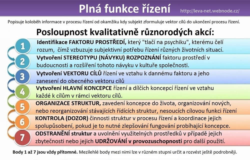 - Řízení podle plné funkce – celostní proces řízení, začínající z určení faktoru prostředí, vyvolávající potřebu řízení, a stanovení cílů ve vztahu k tomu faktoru. Daný proces se završuje dosažením stanovených cílů. ↩︎