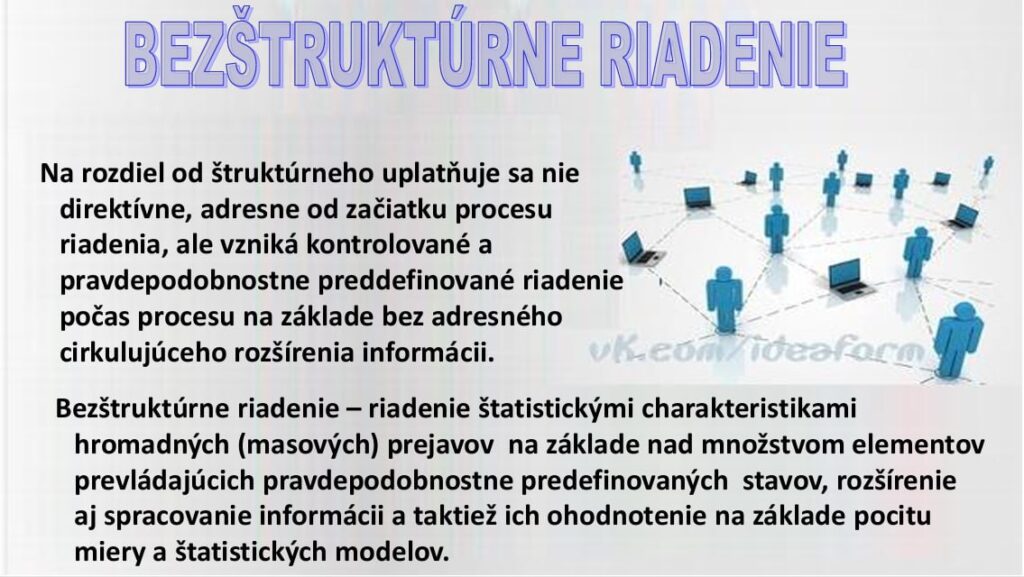 - Bezstrukturní řízení – řízení (ovládání) s oporou na statistické zákonitosti a pravděpodobnostní rozdělení v chování subjektu (cíle) řízení, bez předchozího vytvoření mechanismů přímého řízení. ↩︎