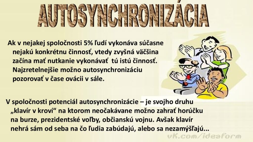 - Autosynchronizace – proces ztotožnění frekvence a fáze kmitů v mnoha různých systémech, což vede k následné spontánní synchronizaci jejich fungování v supersystému. V biologických systémech se projevuje jako davo-elitarizmus, náklonnost jedinců ke stádnímu chování. ↩︎